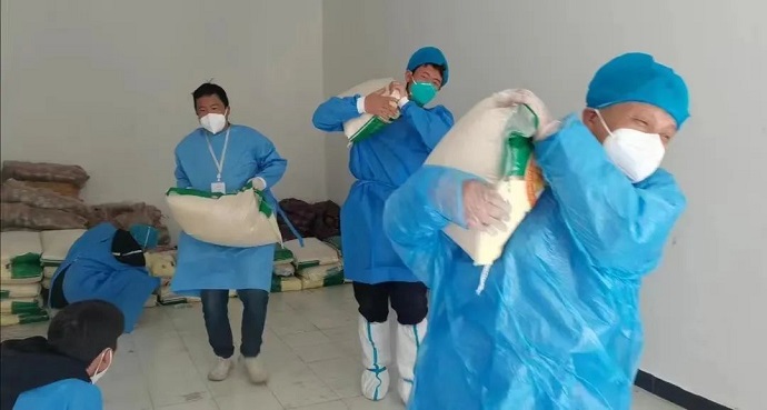 還來不及調整夜班后的身體疲倦,次日中午時分,志愿服務隊就收到了社區進行國慶政府慰問物資配送的通知。為保證社區居民能享受到最新鮮、及時的慰問物資,隊員們重打前一晚的雞血,頂著淅淅瀝瀝的小雨和感冒被感染的風險,再次手抓肩扛,將包裝完好的合計約5噸的糧油水果送到了居民手中。匆忙的腳步、簡單的交流,也讓社區百姓們漸漸讀懂了志愿服務隊的初心。