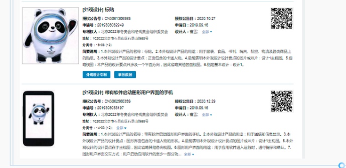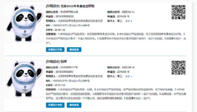 2019年9月,北京冬奧組委向國家知識產(chǎn)權(quán)局提交了4件與冰墩墩相關(guān)的外觀設(shè)計(jì)專利,并于2020年獲得授權(quán)。